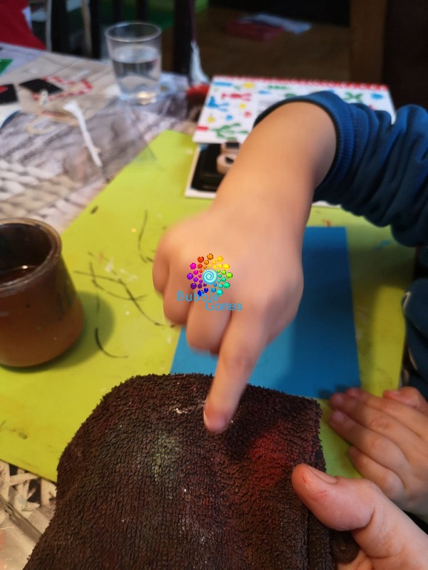 J’ai tracé légèrement une démarcation au crayon à papier en forme de petite colline. Hugo avait la consigne de tamponner avec le doigt la carte pour recouvrir le trait et de remplir l’espace. Je lui ai rappelé l’ordre des mouvements :