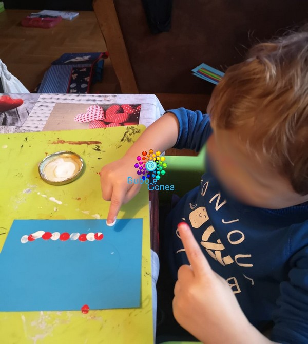 Puis une fois que le sol lui convient, on passe à la réalisation des bonhommes de neige. Là je l’ai guidé pour bien positionner son doigt car il est encore un peu petit. Pour les plus grands, vous pouvez dessiner un petit trait afin que l’enfant fasse une colonne avec ces empreintes.