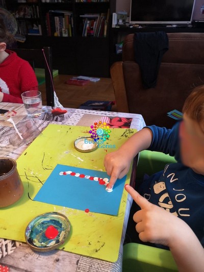Les empreintes de doigts vont se transformer en ampoules lumineuses. Pour cette carte, j’ai dessiné un trait fin au crayon qui s’entortille sur la carte. Hugo avait comme consigne de déposer des empreintes au dessus et au dessous de la carte. Comme il pouvait prendre plusieurs couleurs, la consigne a changé :