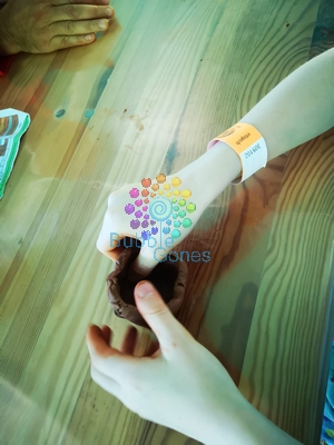 La communauté scientifique n’est pas d’accord sur le but de ces peintures (art décoratif, art chamanique, traces à travers les âges…), mais ces peintures sont remplies de mystère. Sous une tente à l’ombre des arbres, on va découvrir comment réaliser des peintures rupestres. Grâce à trois eaux pigmentées (ocre, rouge et noir) obtenues grâce à des pierres réduites en poudre, on va pouvoir peindre sur une tablette de bois et repartir avec. Différents ustensiles sont à notre disposition :