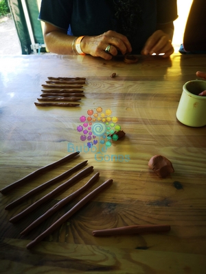 Les hommes préhistoriques aiment décorer leurs poteries avec différents ustensiles : pierre, bouts de bois et coquillages. On a pris beaucoup de plaisir à réaliser cet atelier, on dépose nos poteries sur une table et on pourra les récupérer à la fin de la journée. Il suffira de les laisser sécher deux jours au soleil et le vernir si on veut l’utiliser comme verre ou vase.