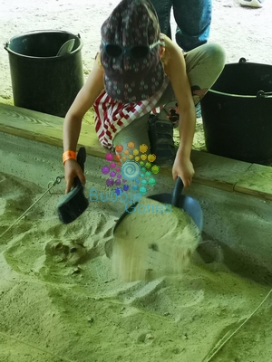 Qui n’a pas rêver de devenir archéologue ? De faire des fouilles et de trouver des objets ou des ossements vieux de plusieurs millénaires. Sous une tente, on découvre la reproduction d’un site de fouille. Après quelques explications de l’animateur, les filles récupèrent un seau et un balais. Elles déblayent le plus gros du sable avec la balayette, puis elles vont les finitions avec le pinceau :