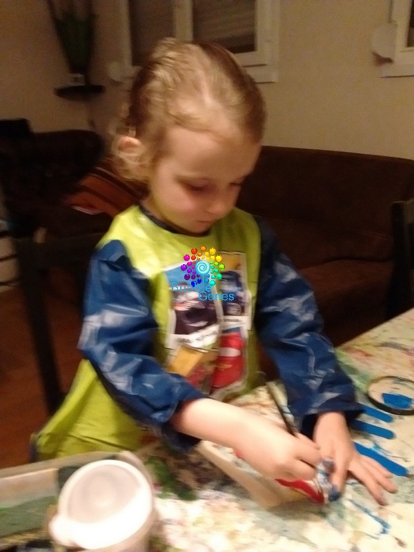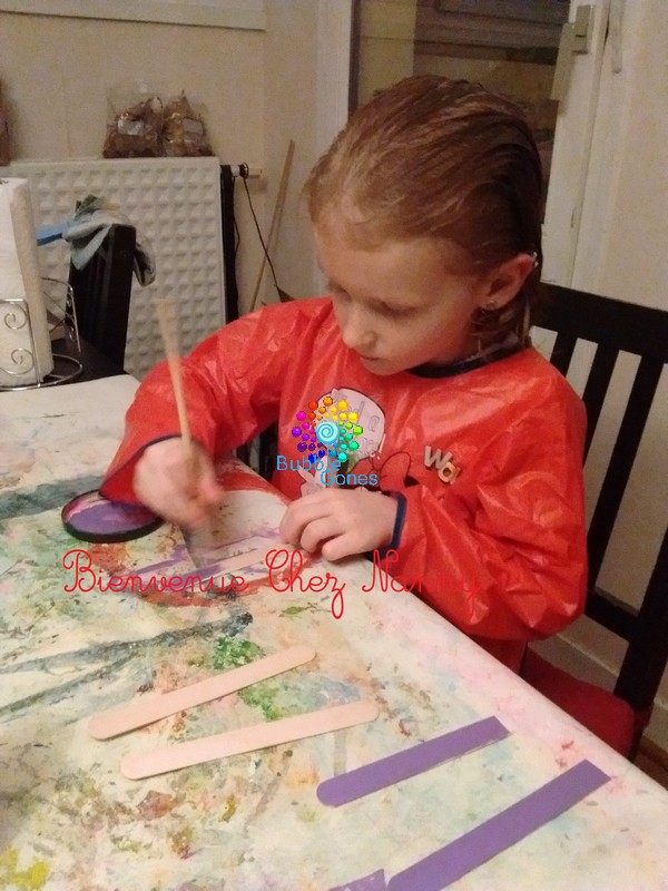 La construction de porte magique est très simple : il suffit de peindre les bâtonnets puis de les coller ensemble, rien de bien sorcier. Mais il faut d’abord choisir les couleurs et là connaissant mes chipies, c’est la chose la plus dur à réaliser. Une fois cela fait, les filles ont été très concentrées pour peindre leurs bâtonnets :