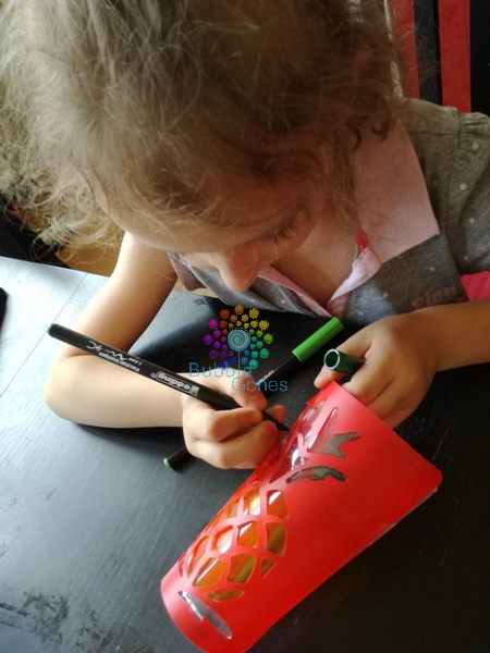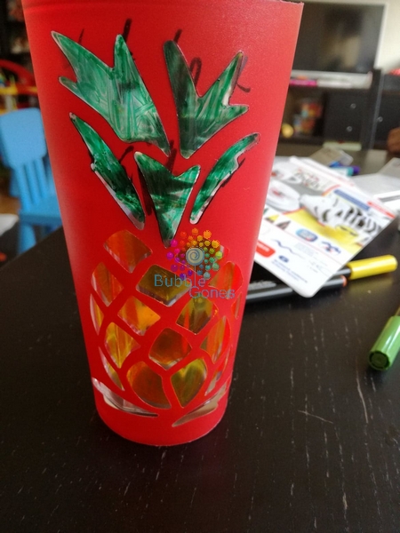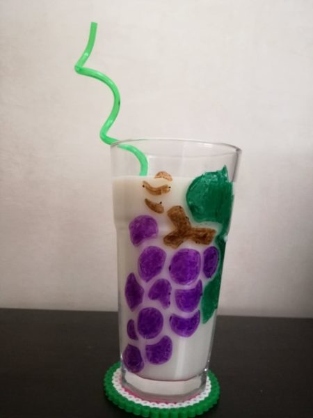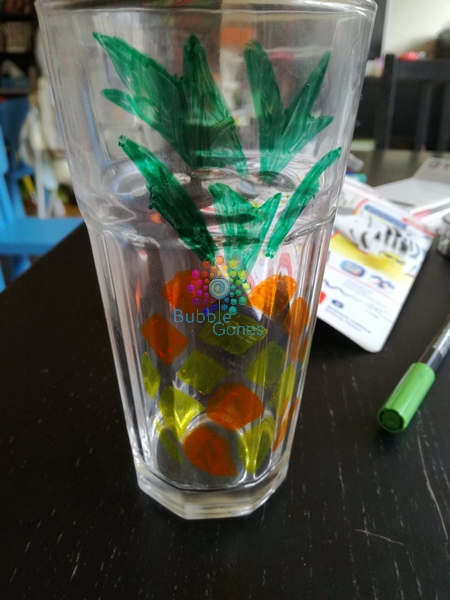 Les filles ont acheté avec leur père un grand verre et des pailles tourbillons de couleur. Je leur ai proposé différents modèles de pochoir que j’avais acheté sur Créavéa. Manon a choisi de réaliser un ananas (c’est top tendance) et Chloé est partie sur le dessin d’un raisin. Je vous conseille vraiment de choisir un pochoir souple afin d’épouser entièrement les contours du verre.