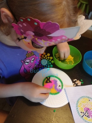 Une fois le modèle réalisé, il suffit de recouvrir les perles par du papier sulfurisé et de faire fondre les perles avec un fer à repasser jusqu’à ce que le papier devienne transparent.