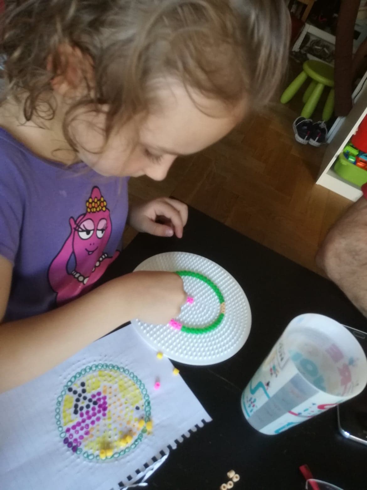 Du coup, j’ai passé une feuille de brouillon sur la planche à picot pour marquer les points et j’ai reproduit le modèle pour aider Manon. Ensemble nous avons compté les lignes et elle a crée son modèle peu à peu. J’ai d’abord compté à combien de perles du centre se trouvait le cercle extérieur et elle a commencé par faire ce rond vert. Puis elle a réalisé les pattes, le corps et le cou du flamand rose. Une fois fait, elle a rempli le fond en jaune.