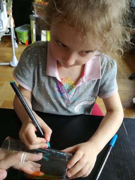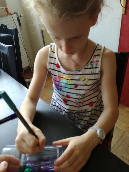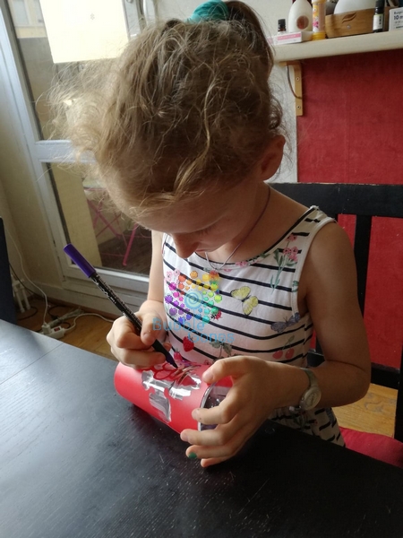 Les filles ont choisi leurs couleurs pour décorer leur verre. Afin que le pochoir ne bouge pas, je l’ai scotché directement sur le verre