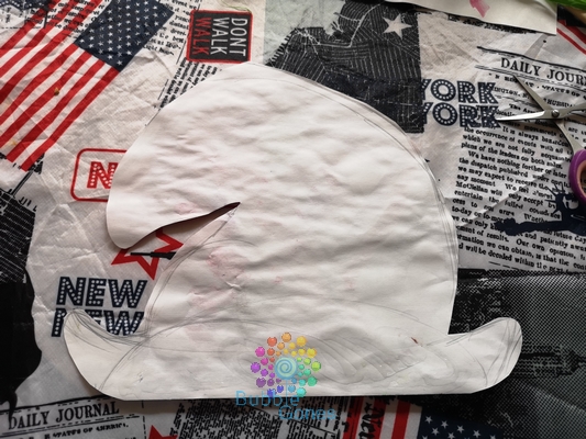Pendant ce temps, j’ai découpé deux triangles blancs et dessinés des yeux. Pour les yeux je les dessine à main levé. Je fais un premier oeil sur une feuille blanche, puis je plie la feuille en deux. Je me positionne sur la fenêtre afin de pouvoir repreduire le deuxième oeil à l’identique.