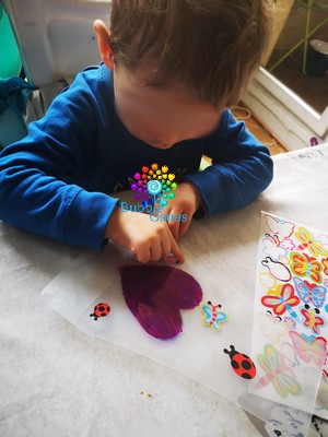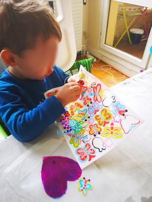 Puis une fois, le feutre sec (ce qui a permis une petite pause jeu ^_^), Hugo a collé des gommettes sur les deux côté du vase. On a choisi des gommettes qui reste sur le thème : fleurs, papillons, libellule, coccinelle.