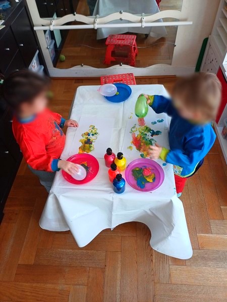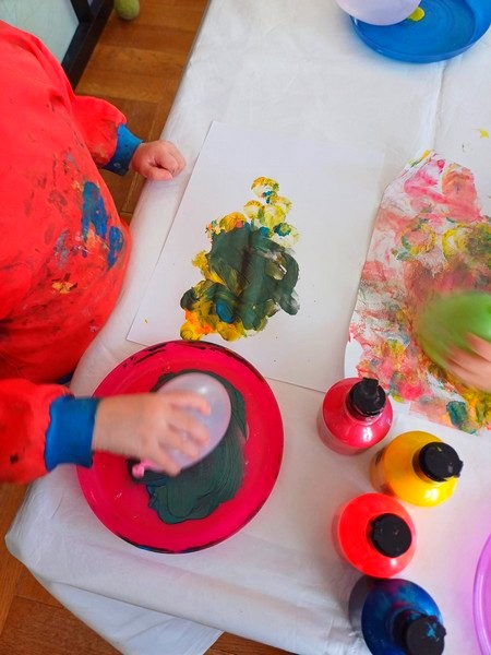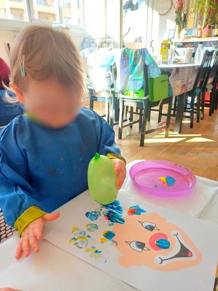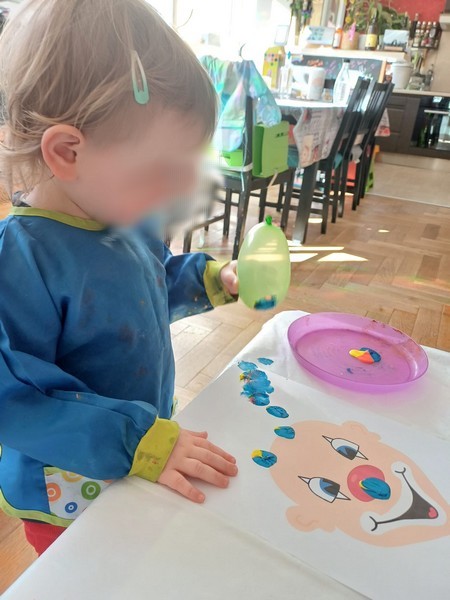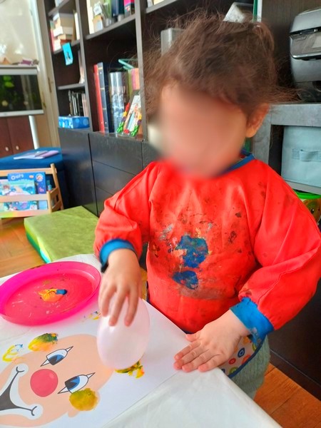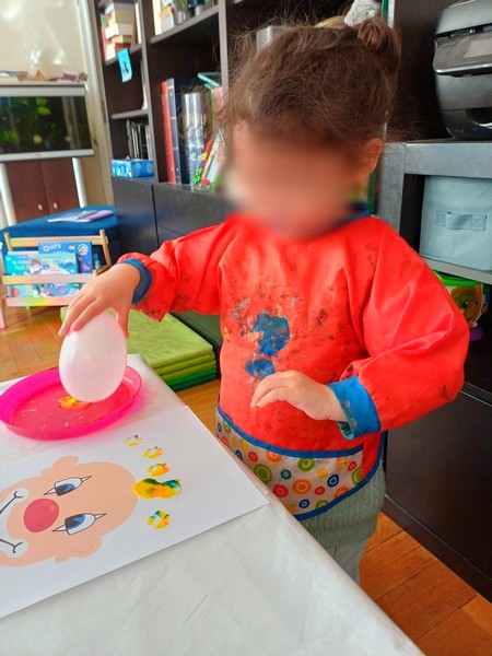 J’ai le clown sur une grande feuille A4, en le positionnant en bas de la feuille. Avec les filles nous avons choisi trois couleurs de peinture flashy. J’ai déposé trois “crottes” de peinture sur des assiettes, assez proches les unes des autres, ainsi quand le ballon sera trempé dans les peintures, il prendra les trois couleurs.