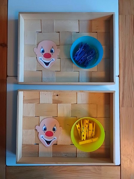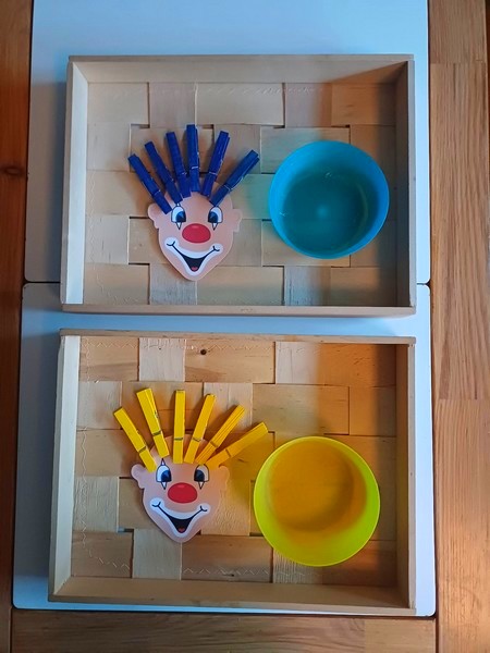 J’ai coloré mes pinces en bois en bleu et jaune pour faire de jolis cheveux à nos clowns qui ont en bien besoin. J’ai positionné mes pinces à linge dans le bol (vous pouvez aussi les pincer sur le contour de celui-ci), j’ai présenté plusieus fois le mouvement afin que les filles le comprennent et puissent le reproduire : La manipulation de pinces à linge n’est pas un geste facile à reproduire, il ne demande pas spécialement de force, mais de la dextérité et de la précision. Mais il faut surtout comprendre le mouvement, ou appuyer sur la pince, maintenir le mouvement et le relâcher au bon moment ! C’était une première pour mes deux accuellies, A deux ans pour l’une et T, deux ans et demi .Ce diaporama nécessite JavaScript.
