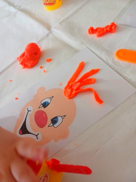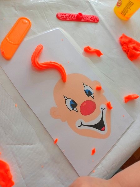 Ce week end j’ai acheté un petit appareil de pâte à modeler de la marque Play-Doh à action. Celui-ci permet de presser la pâte à travers un moule pour lui donner une forme. Impatiente de le faire tester à mes accueuillies j’utilise ma tête de clown chauve comme support. Je l’ai imprimé sur du papier cartonné puis je l’ai plastifié.Matériel