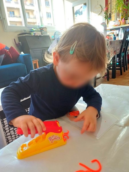 J’ai protégé ma table d’activité avec une nappe pour j’ai sorti ma fiche “tête de clown” et ma pâte à modeler. J’ai fait la démonstration aux filles du fonctionnement de l’appareil de Playdoh : c’est très facile d’utilisation : il suffit d’insérer la pâte à modeler d’un côté, puis d’appuyer sur le manche et la pâte sort de l’autre côté.