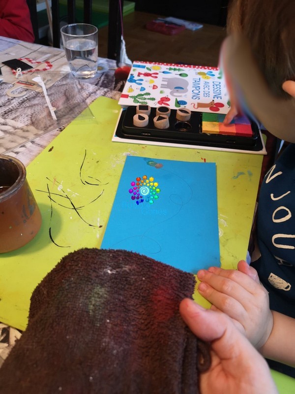 Hugo a posé ces empreintes les unes collées aux autres au départ, du coup je lui ai montré qu’il pouvait les mettre aussi au dessus du fil, que ça serait joli aussi.