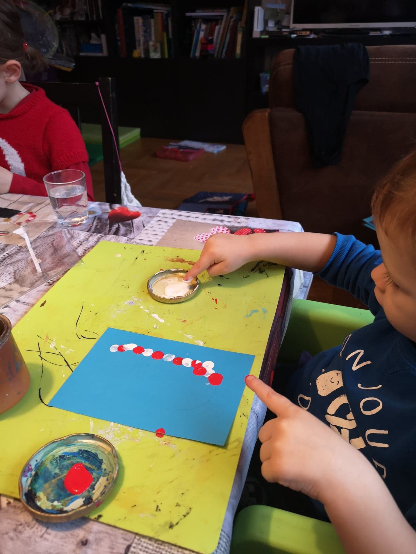 J’ai dessiné un J à l’envers qu’Hugo a recouvert de ses empreintes de doigts en alternant les couleurs. Pour l’aider dans cette alternance, on a fait une main rouge et une main blanche, pour les plus grands vous pouvez faire index et majeur : le but étant de recouvrir le trait avec les empreintes.