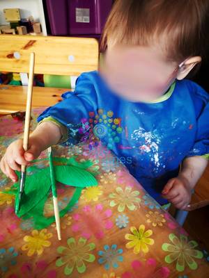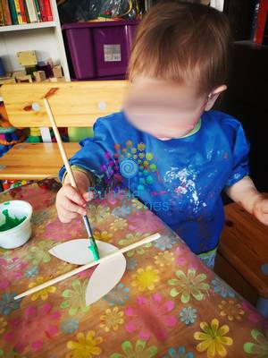 Ce tuto est très simple à faire. J’ai peint en vert le pied de Miss L que j’ai déposé sur la feuille verte. J’ai tracé la tige du brin de muguet avec la même peinture. Puis avec son idex, Miss L a déposé son empreinte qui se transforme en clochette.