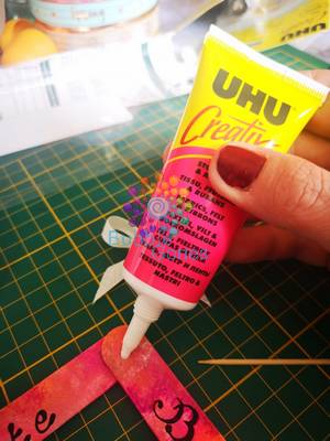 J’ai découpé un gros coeur dans une assiette en carton que j’ai collé sur une baguette chinoise avec la colle UHU créativ’ bois & matérieux naturel UHU.