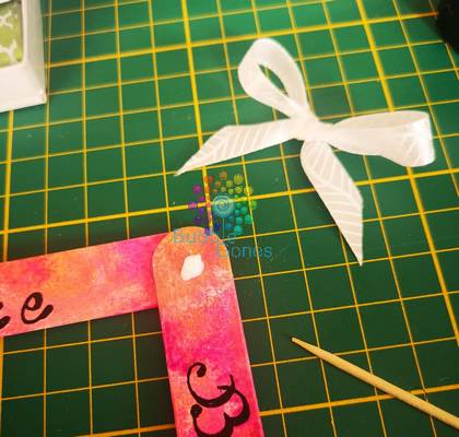 J’ai réalisé un noeud avec un ruban blanc que j’ai collé avec la colle UHU créativ’ pour tissu, feutrine & ruban sur le cadre, puis j’ai fait de même pour un ruban pour le suspendre.