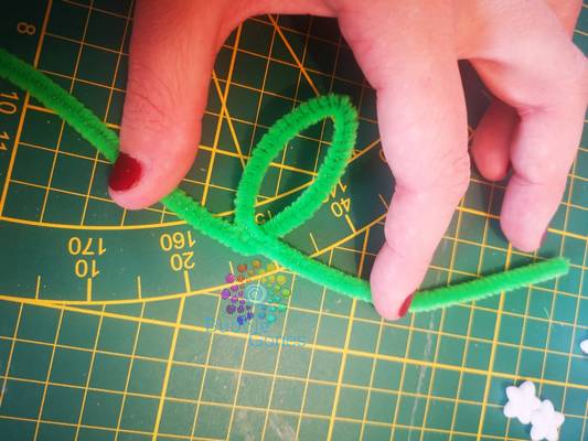 J’ai collé les bâtonnets pour former un cadre carré avec la colle UHU créativ’ bois & matérieux naturel UHU. J’ai tamponné le bois avec de la peinture acrylique jaune, violet, rose et blanc. Le temps que la peinture sèche, j’ai construit mon brin de muguet avec deux cure pipes vert. J’ai plié en deux puis en quatre pour réaliser les feuilles.