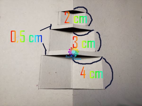 J’ai enlevé 1 cm en largeur et en longueur sur la feuille claire qui viendra se coller sur celle foncée. J’ai marqué le pli central. Au dos de la feuille, j’ai dessiné les rectangles. Sur le modèle, vous verrez ce qu’il faut plier et découper au cutter ainsi que les mesures :