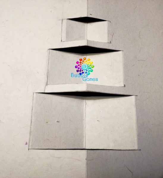 Comme pour les autres j’ai recoupé la carte marron qui serait collé sur le fond afin de faire comme un cadre. J’ai dessiné un modèle sur une feuille de brouillon. Je me suis aidée d’un brouillon sur lequel j’ai dessiné des triangles dont j’ai découpé les côtés et plié la base.