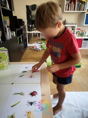 Ils prennent le temps de regarder les photos et de chercher l’illustration qui correspond à l’insecte qu’ils ont dans la main. Ils sont ravies quand ils le découvrent. J’en profite pour travailler le vocabulaire en rappelant le nom de l’insecte, en comptant le nombre de pattes, en observant s’il a des ailes ou pas…