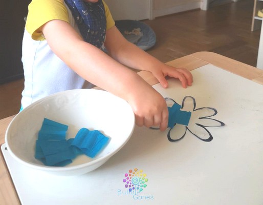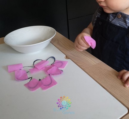 Puis je l’ai collé à l’envers avec de la pâte à fixe sur la table d’activité, j’ai décollé l’envers et mis le bol contenant le papier crépon à côté.