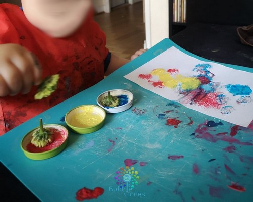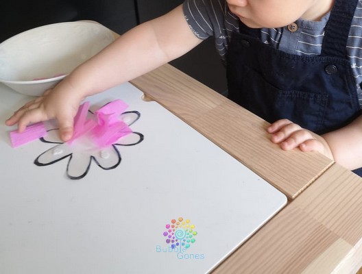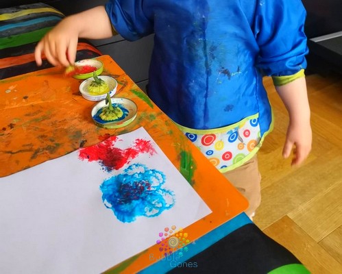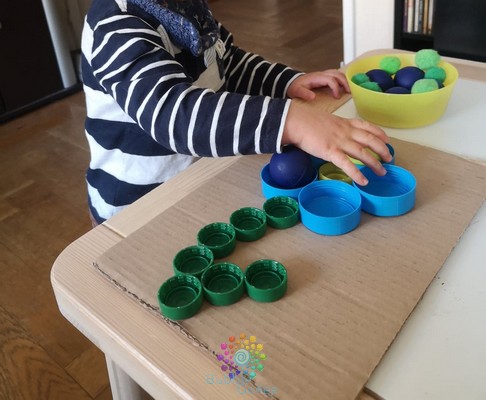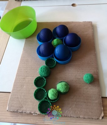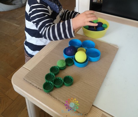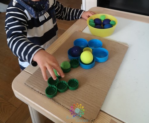 Je positionne la feuille d’activité sur ma table, afin que celle-ci ne bouge pas, je l’ai “collé” grâce à de la pâte à fixe. J’ai mis les balles dans un bol à côté. Je n’ai même pas eu besoin d’expliquer l’activité aux garçons, ils ont compris et ont placé les balles dans les bouchons. Les garçons ont 18 mois, on a pas encore abordé les couleurs, je les guide un peu, mais je les laisse jouer comme ils le souhaitent :Ramasser les fleurs