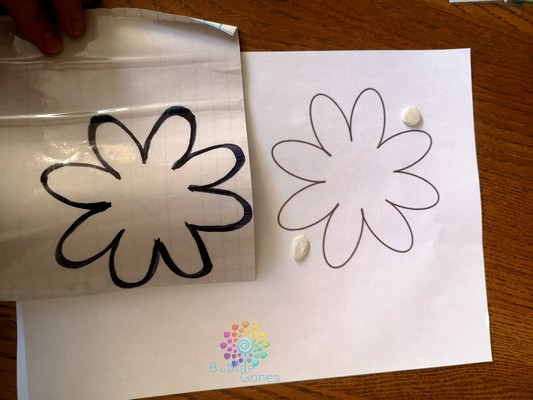 J’ai reproduit le modèle de la fleur avec un marqueur sur le couvre livre en m’aidant de la fenêtre pour voir les traits.