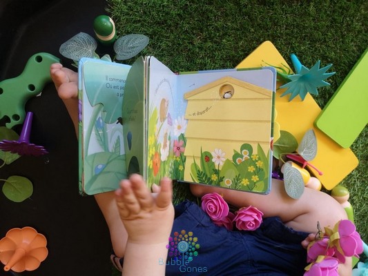 - sur la table d’activités, en solo, accompagnées d’un livre ou d’insectes en plastique
