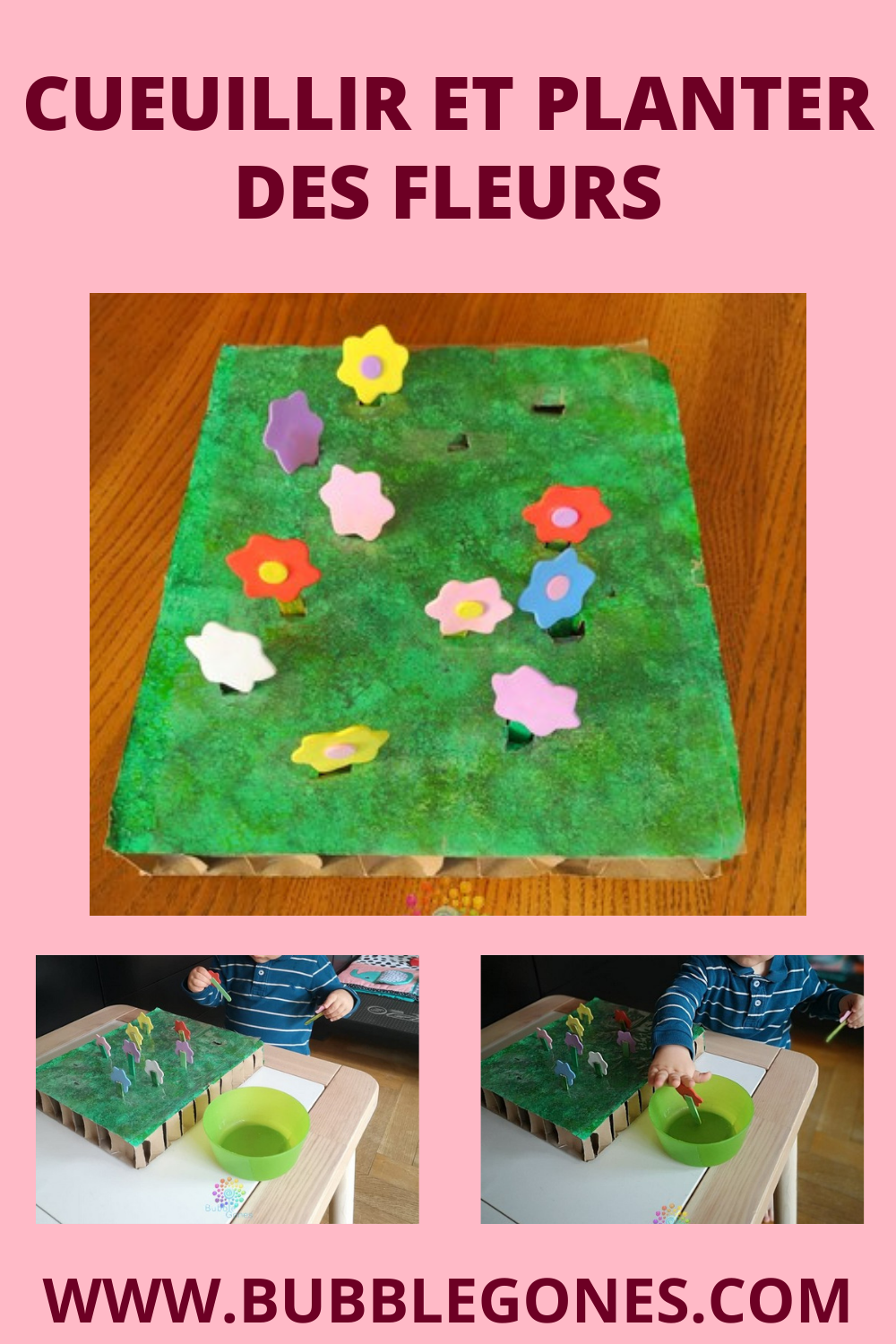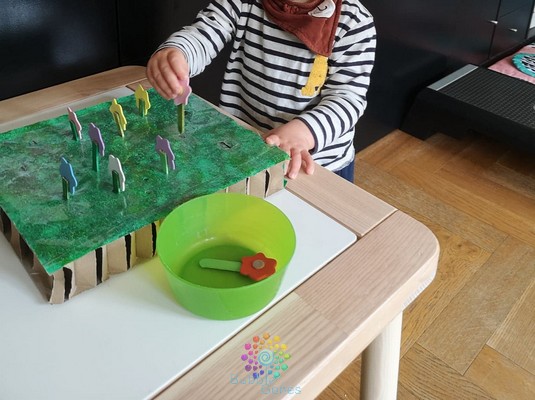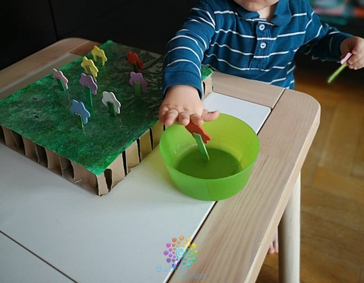 Le carton glissant sur ma table d’activité, je le maintiens grâce à de la pâte à fixe. Pour la première phase de cette activité, le but est de ramasser les fleurs et de les mettre dans le pot. Pour cela j’ai planté mes fleurs dans mon carton pelouse et mis le bol à côté. Les garçons ont tout de suite compris ce que j’attendais d’eux. Ils ont cueilli leurs fleurs. Bon par contre pour la partie mettre dans le bol, ça, c’est une autre histoire… C’est beaucoup plus drôle de les garder en main et de les planter un peu partout dans la salle de jeux ^_^ Cette activité de cueillette de fleurs peut aussi se transformer en plantation de fleurs. Les enfants apprennent à tenir la fleur par les pétales au lieu de la tige. Au départ c’est difficile pour les garçons et au bout de quelques jours, ils arrivent à planter les fleurs :Remplir les pétales de la fleur
