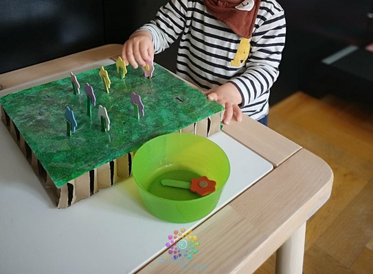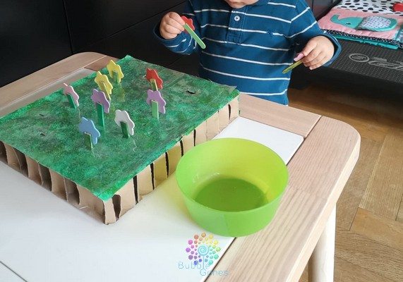 J’ai d’abord peint mon gros carton avec des nuances de vert, pour un effet herbeux, j’ai utilisé un tampon. Une fois la peinture sèche, je l’ai recouvert avec du papier couvre livre autocollant, histoire de protéger mon carton, car je connais ces petits doigts délicats. J’ai ensuite fait des entailles à intervalle régulier avec le cutter : la largeur de ces trous est légèrement plus grande que les bâtonnets de glace. J’ai coloré mes bâtonnets avec un feutre vert, puis je les ai coupé en deux. Ensuite, j’ai déposé une goutte de colle afin de coller les fleurs de mousse sur le bâtonnet.