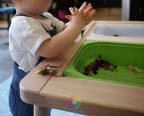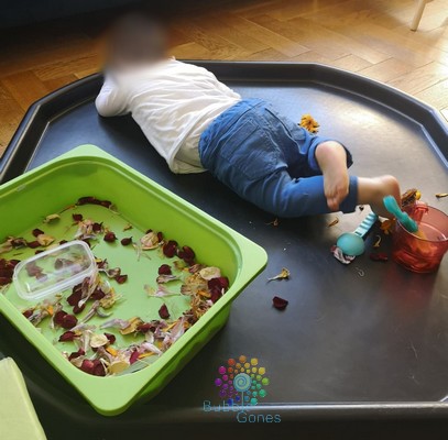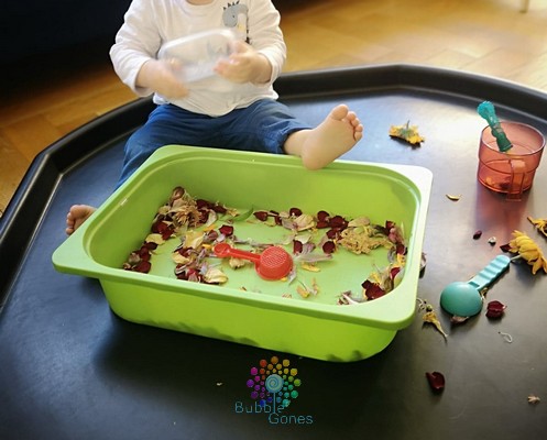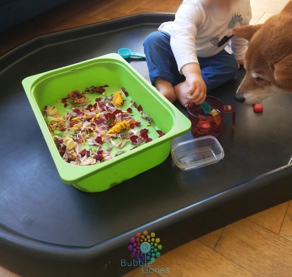 J’ai gardé les fleurs de mon bouquet et je les ai fait sécher. Une fois fait, je les ai mis dans un bac avec différents instruments de transvasement : différentes sortes de cuillère, récipients… J’ai installé le bac de fleurs au centre du bac d’exploration de Hoptoys, limitant ainsi les “dégats” à côté. Vous pouvez retrouver ce bac par ICI