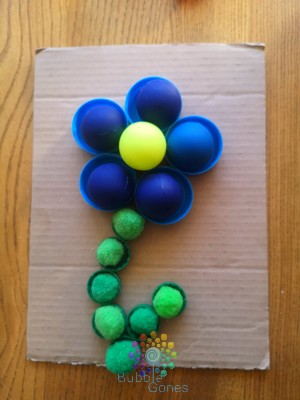 J’ai gardé des bouchons de différentes couleurs pour créer des jeux pour les petits. J’ai positionné mes bouchons sur le carton afin de former une fleur. Une fois le dessin obtenu, j’ai collé mes bouchons avec le pistolet à colle. Et voilà la partie bricolage est finie :Activité