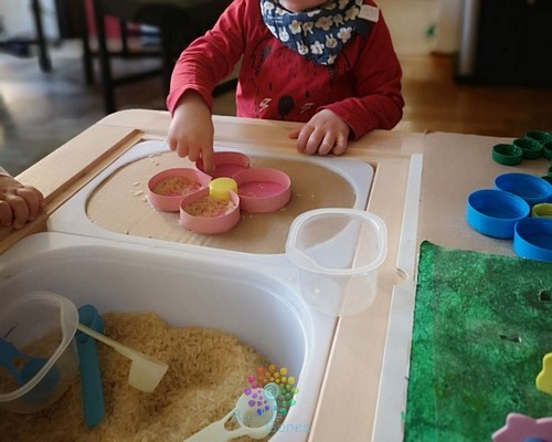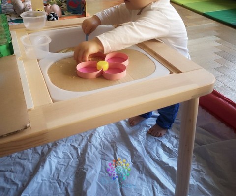 Je positionne la table dans une petite piscine afin d’éviter d’en avoir partout par terre, ainsi l’exploration est libre et sans danger pour les petits autour.