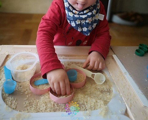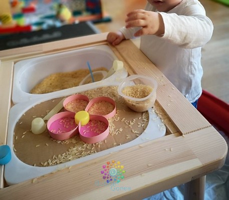 J’ai positionné mon couvercle d’activité sur le plus petit bac. J’ai inséré ce bac ainsi qu’un deuxième sur ma table. J’ai rempli le 2ème bac avec du riz et j’ai mis des cuillères à disposition. J’en ai choisi 4 afin que les garçons puissent en avoir dans chaque main (je les connais, ils voudront surement en avoir 2).