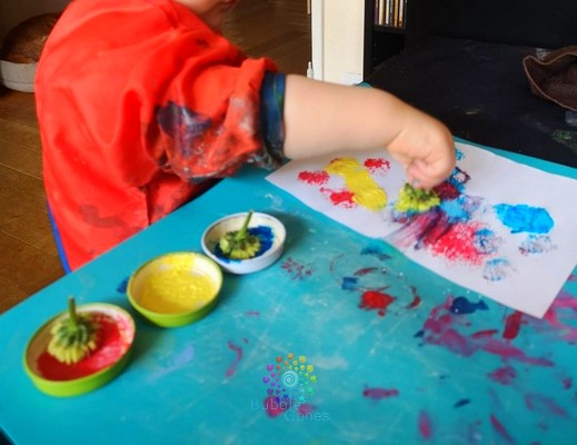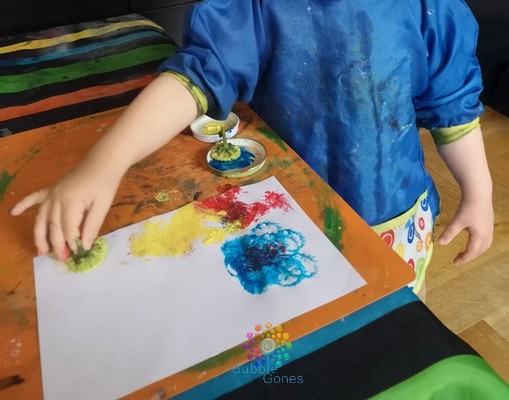J’avais envie de garder un souvenir de notre activité autour des fleurs, j’ai proposé aux garçons de peindre avec des fleurs. J’ai conservé les plus belles fleurs, afin de les transformer en tampon.