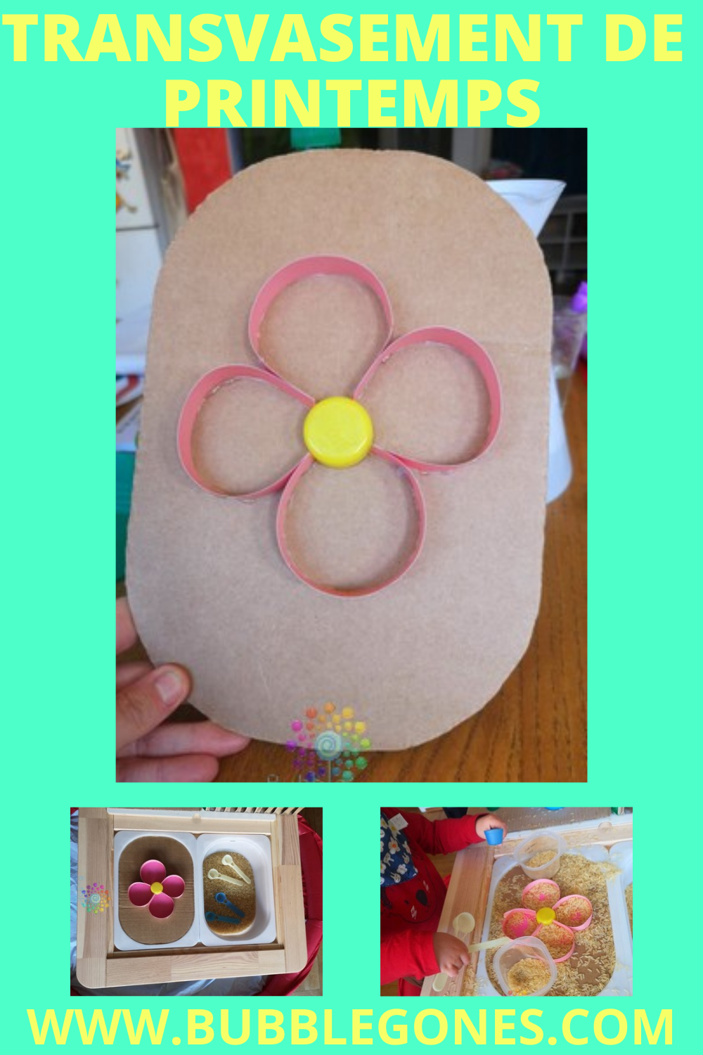 Les enfants adorent manipuler, jouer, transvaser… Je leur propose un mini monde en reprenant des éléments qu’ils ont déjà manipuler avant :- fleurs à monter
