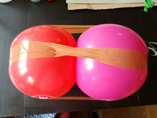 Pendant que la colle refroidit, j’ai monté la base qui me servira de forme pour ma pinata. Pour cela, j’ai gonflé deux ballons que j’ai scotché ensemble.