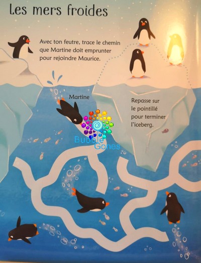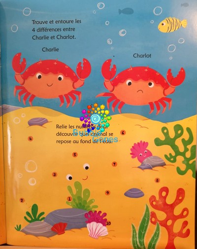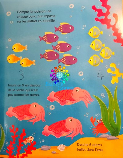 L’enfant va travailler le graphisme, les nombres, la reconnaissance, l’observation et le vocabulaire de la mer à travers différents petits exercices dans un univers très coloré. Les illustrations sont ludiques, belles et détaillées sans être trop riches pour ne pas noyer le petit lecteur.