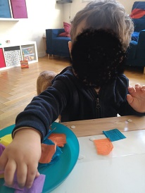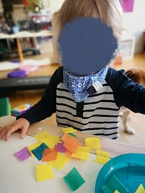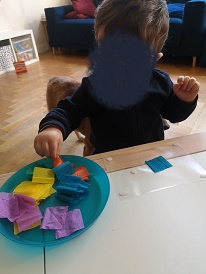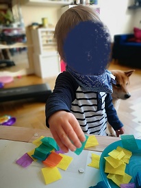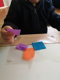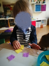 J’ai découpé des morceaux de papier crépon assez gros, vu que les garçons ont moins de 18 mois. J’ai préféré le papier crépon au papier de soie beaucoup moins fragile, et donc moins de risque que cela se déchire. Je n’ai pas mélangé les couleurs afin que les garçons aient le choix visuel.