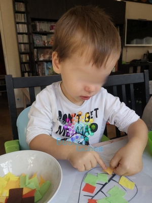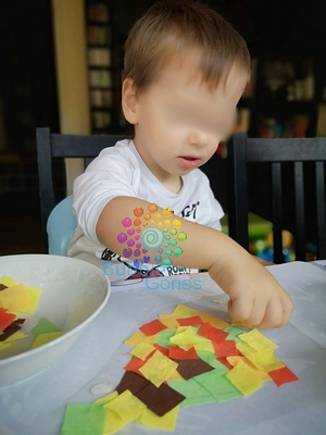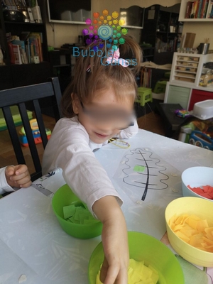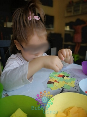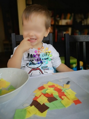 J’ai collé avec de la pâte à fixe le papier autocollant sur un set de table. J’ai enlevé le papier blanc protecteur. J’ai donné les bols de papier crépon et les modèles aux loulous pour les laisser créer comme ils souhaitaient leur feuille.