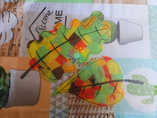 J’ai d’abord proposé différents modèles de feuilles aux loulous. Mademoiselle A et mister L ont choisi les leurs et je les ai reproduit sur le côté transparent non collant du papier. Manon a réalisé son modèle toute seule.