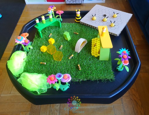 Dans ce bac, ils vont retrouver :- La ruche en carton et les abeilles en œuf kinder