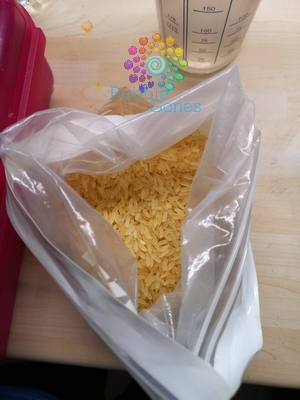 Je mets un peu de colorant en poudre au fond du sac ziploc. Je le dilue avec du vinaigre blanc. Puis je verse dedans le riz blanc et je ferme le sac ziplo. Je malaxe le sac afin de bien répartir le colorant dans tout le riz. Le orange obtenu est puissant. Le riz est légèrement humide et odorant. Je mets deux feuilles de sopalin sur un plateau et je renverse le riz dessus. J’ai laissé une nuit entière sur le balcon histoire que le vinaigre s’évapore. J’ai fait la même chose pour le riz coloré en noir.