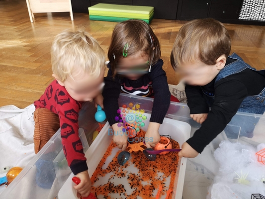 L’apprentissage et la découverte passent par l’expérimentation et la manipulation. En plus des bouteilles sensorielles halloween (que vous pouvez découvrir par ICI), j’ai créée un bac sensoriel pour que les enfants manipulent et découvrent des nouvelles textures.