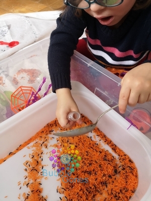 Alors je ne suis pas fan de jouer avec la nourriture si cela est éphèmère. Du coup, en transvasement, j’utilise beaucoup les éléments secs comme le riz, la semoule, les pois chiches et pois cassés. Cela fait trois ans que j’ai un sachet et que je sors régulièrement. Du coup sur le long terme, c’est un investissement. Pour ce bac spécial halloween j’ai refais du riz coloré pour mettre en avant deux couleurs.