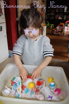Cette activité sensorielle demande un peu de travail en amont : j’ai fait prendre des petits bonhommes dans la glace : des marionnettes Monsieur et Madame