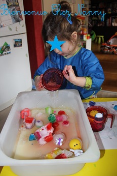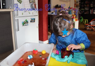 Une belle activité qui nous a occupé 1h et encore parce que c’était l’heure d’aller à l’école. Bonne 1ère expérience de bac sensoriel, bon j’avoues que je ne pourrais pas faire aussi bien que Sandrine car j’ai pas la place de stocker tout le matériel nécessaire. Mais je pense que je vais y réfléchir pour en proposer d’autres.