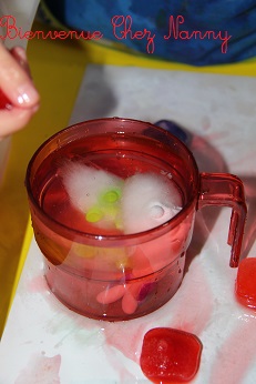 J’ai aussi mélangé de la peinture à de l’eau que j’ai mis dans des glaçons direction le congélateur